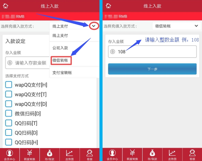 登入账号后,点击屏幕下方导航中的存/取款--存款,再点击右上角充值方式下拉菜单--选择微信转账,并填写存入金额。注:此处存入金额只支持整数,不支持小数点。
