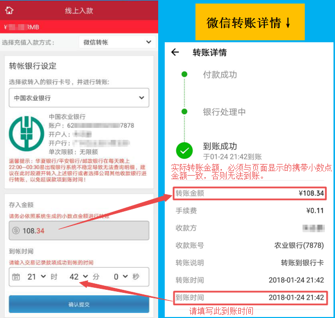 进入微信转账页面后,记录/复制好公司收款银行账户,登陆您的微信进行转账,且微信实际转账金额必须与页面显示的金额一致。转账成功后,等待转账详情--显示到账成功。按照提示填写您的到账时间,在点击确认提交。(温馨提示:使用微信转账至农业银行是即时到账的;务必先转账成功在提交,否则财务人员查询不到款项无法第一时间帮您添加额度。)